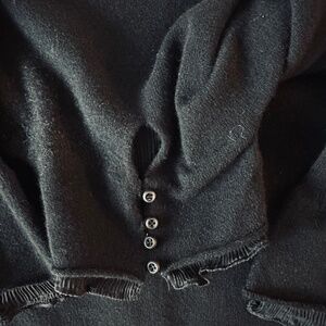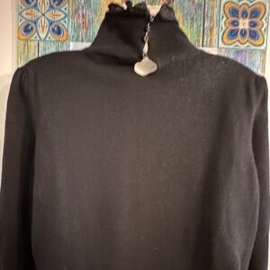 THIS SWEATER HAS A DOUBLE HIGH NECK COLAR AND LONG SLEEVED DOUBLE CUFFS, WHICH GIVES THE ILLUSION OF WEARING A SLIGHTLY RUFFLED UNDER GARMENT, THE SHOULDERS APPEAR A LITTLE PUFF, AND FULL DISCLOSURE EACH SHOULD ON THE SEAM THERE IS A TINY SEPARATION . THIS FLAW WILL BE ADJUSTING THIS SWEATERS WORTH.