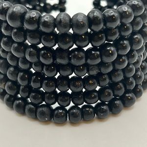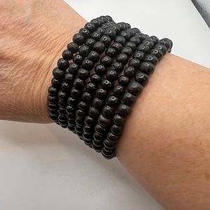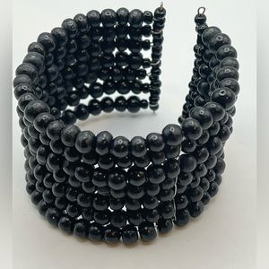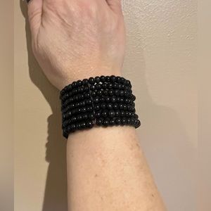 Very cute black bead bracelet. It’s adjustable as it stretches and conforms to your wrist. Beads are plastic and are very lightweight.