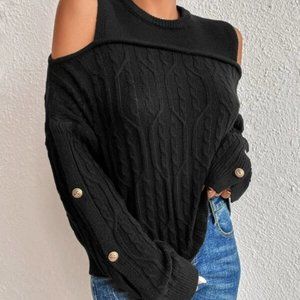 BLACK Button Detail Cold Shoulder Knit Sweater Top