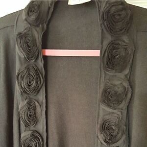 The perfect little jacket/sweater to throw on w/ almost anything. Feminine, flirty & stylish. It can dress up any ensemble, especially a monochromatic one. It has 3/4 sleeves measuring 17", from shoulder to bottom is 18" & to bottom of cascade is 29". Size is M.