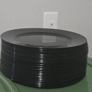 50 BLACK 13 INCH CHARGER PLATES. SELLING THEM AS A SET/ MAKING THEM LESS THAN .75 CENT EACH.