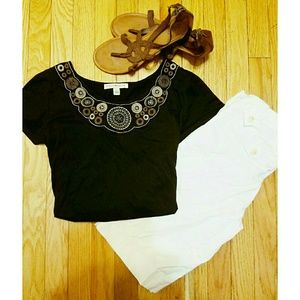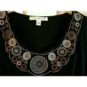 This top is a scoop neck with beautiful circular stitch detail along the neckline. All stitching is in tact, no snag, tears or stains.