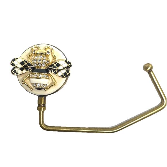 Keep your handbag clean and off the floor with this chic black and cream jeweled bee purse hook. Features a beautifully enameled bee with sparkling rhinestones set on a gold-tone fold-out hook. Portable, sturdy, and perfect for restaurants, office desks, travel, and everyday use.