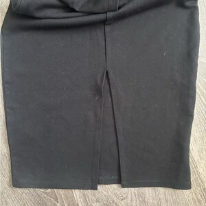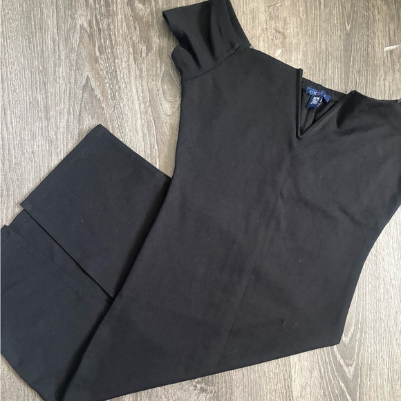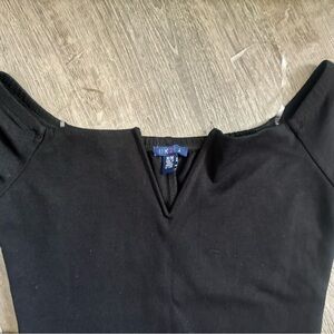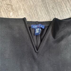 black V-neck off the shoulder dress with back slit detail. size medium but can fit a small in my opinion. brand is uk2la bought in mandees store.