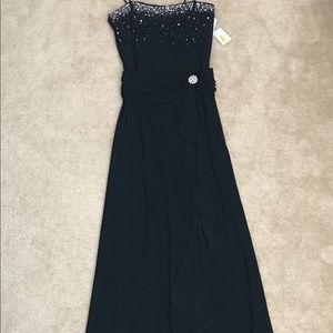 Black. Size 3/4. Never worn (tags still attached). Dave and Johnny by Laura Ryner gown with pearls and rhinestones. 90% polyester/10% spandex-fully lined. Originally $180.00