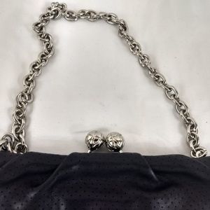 Very sexy black faux leather evening clutch with chains and attractive clasp. Very nice little clutch, technically pre-owned but shows no wear inside or out. Vented outer has a very nice soft leather feel. Clasp works well and clutch opens wide for easy access to your items. 15 X 5.5 X 1 by FRANCHI. Lined, very high quality item. VINTAGE STYLE. Poshmark #2 (SP)