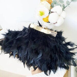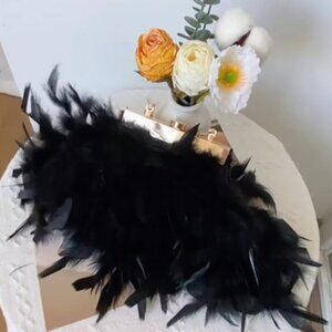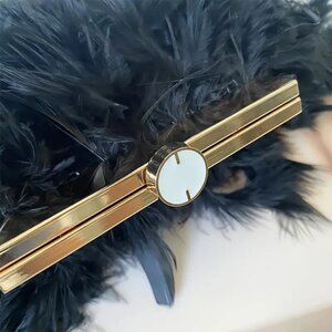 New in original packaging. Fun and showy evening bag covered in black feathers. Contemporary closure, unique style. Chain included. Measures approximately 7" long, 5" tall.