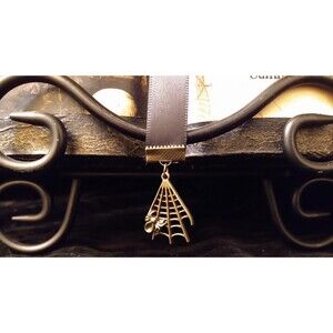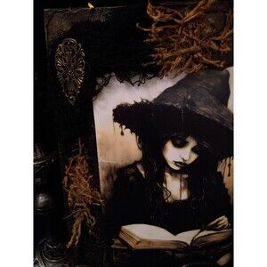 Open Spell book aged to perfection with golden highlights & a studious witch casting her spell. Adorned with dried moss, spider, black satin bookmark with a spider web brass charm and tattered fabric.