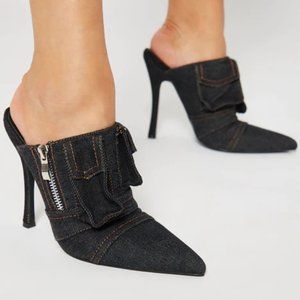 Featuring floral embroidery on a faux suede black background. Great transitional piece with a comfortable chunky heel, pointy toe and ankle straps with gold tips. Pre-loved but always in great shape. Sole shows some signs of wear.