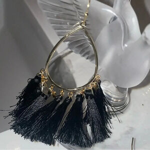 BLACK FRINGE DROP TEARDROP HOOP EARRINGS GOLD TONE FUN AND FESTIVE