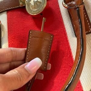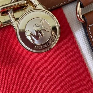 Michael Kors large sophisticated bagNWOT! Material textured red/off white w/off white stitching genuine soft. leather surrounded and gold accents. Magnetic snap closure.two sets of handles one with leather & gold chain longer strap- both can be carried hand/shoulderyur preference. Very roomy inside. Please view pics for inside details. Measurement: L12"xH14"xD16"xD23" longer handle with gold chain