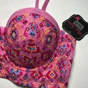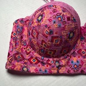 BLACK FUCHSIA by Secret Lace Bra 36B Push Up Wide Band Stretch Lace Pink Geo Print Underwire