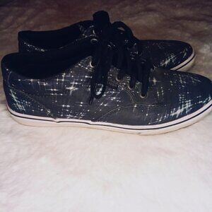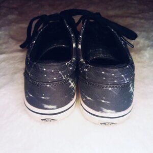 Low top black galaxy vans, good condition. Black laces with star print across the shoe. Canvas material. A few minor flaws but otherwise great condition. Unique celestial pattern.