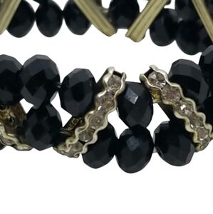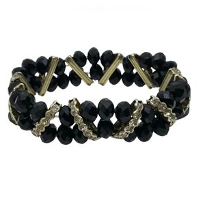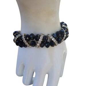 Lovely vintage bracelet made up of two rows of black glass beads and white rhinestone accents.  Bracelet is stretch and measures 1-1/4 inches wide.