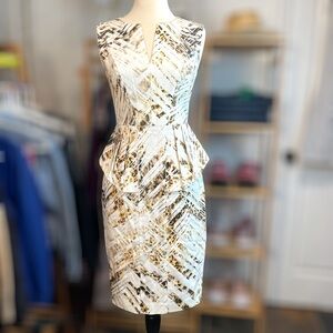 An absolutely fabulous dress from BLACK HALO. This dress features a cool abstract leopard print and a wonderful pleated peplum. V-neck. Fully lined. Back zipper. Size 2.