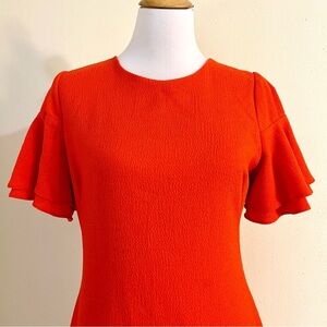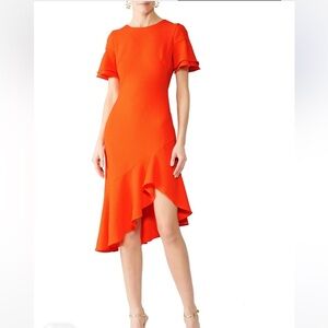 This striking orange dress by Black Halo features an asymmetrical high-low hemline with dramatic ruffles, perfect for a wedding guest or cocktail event.
