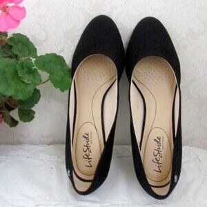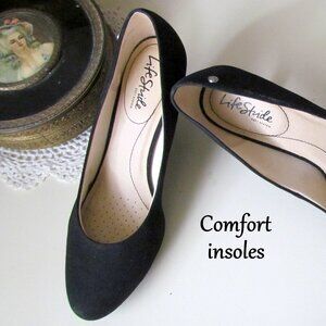 These are new shoes from Life Stride, made for comfort with their quality insoles. They have great non-skid soles. These classic shoes will go with almost anything, and the toe shape and heel height will made them easy to wear for hours.