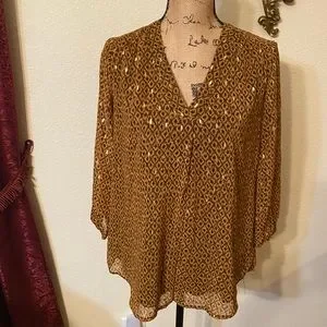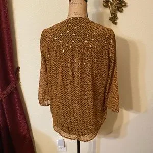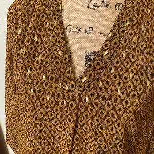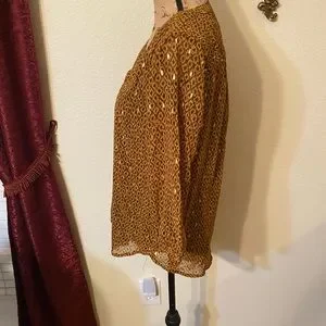 Gorgeous LIKE NEW in EXCELLENT condition Black Label by Evan-Picone blouse. Sheer and lined. Roomy. Hangs beautifully. Shades of brown embellished with metallic gold. V-Neck. Worn once and laundered once. Size small.