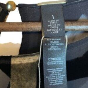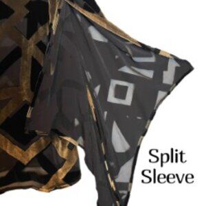 • NWT FROM CHICO'S EXCLUSIVE BLACK LABEL COLLECTION KNOWN FOR IT'S ELEVATED, SOPHISTICATED STYLE AND LUXURIOUS FABRICS LIKE THIS GEOMETRIC BURNOUT VELVET DESIGN IN BLACK AND GOLD TONES. DRESS IT UP OR PAIR WITH LEGGINGS OR JEANS FOR A CASUAL LOOK.