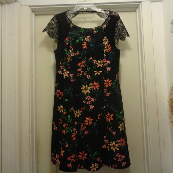 BLACK LACE & GARDEN PARTY GIRL SWEET DRESS 12. THIS IS SUCH A PRETTY DRESS. THE LACE IS ON THE SLEEVES AND FASTENS UP ON THE NECK IN BACK. IT IS POLYESTER. IT WAS MADE IN MEXICO. IT IS A THICKER KNIT. IT HAS A ZIPPER. THE BRAND TAG IS GONE. FROM UNDERARM TO UNDERARM ALL THE WAY AROUND THE PIECE IS 40 INCHES. WITH LIGHT WEAR YET PLENTY TO SHARE WITH YOU LUCKY BUYER. 4TH GROUP. #408. THANKS