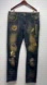 Stylish men's blue distressed jeans with unique patchwork design. Perfect for a casual, trendy look. A fusion of cut and sew elements, stylish patches, and detailed embroidery. These jeans are crafted for those who seek a unique blend of comfort and edgy design. Elevate your denim game with this exclusive piece that showcases your fearless style.