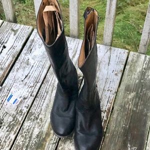 These have been lovingly walked in but still very wearable. Thick black leather designed by Frye and made in Mexico. A few scum marks showing great ccharacter and patina. zips up the back and has snap buttons on top and on the back of heels.