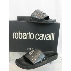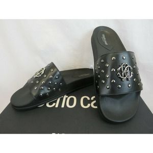 ROBERTO CAVALLI BLACK LEATHER SNAKE MEDALLION LOGO STUDS SLIDES
