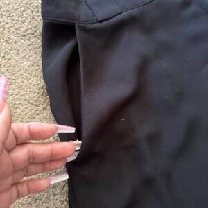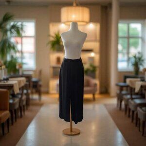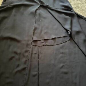 This sleek black long skirt combines elegance with a touch of daring thanks to a dramatic front split that reveals a playful short skirt underneath. Designed with convenient side pockets and a discreet back zipper, it fits comfortably with a 26-inch waist and measures 41 inches long. Perfect for stepping out in style while keeping things fun and flirty! Previously owned with tags removed, this skirt is ready to add charm to your wardrobe.