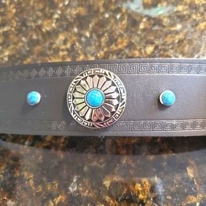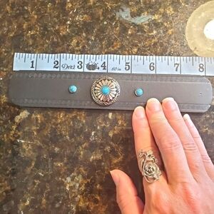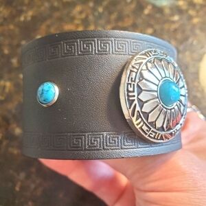 BLACK Leather Cuff Bracelet with Turquoise and Metal Cabochon