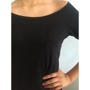 Off the shoulder top. Quarter sleeves. Black. Pocket on left breast.