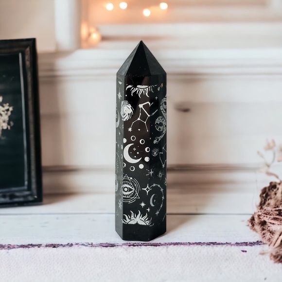 BLACK Obsidian Silver Cosmic Symbols Protection Crystal Obelisk Towers