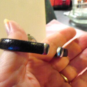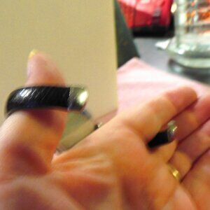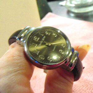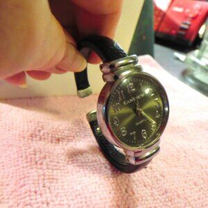 Beautiful black leather toggle strap - accented by silver colors - very nice watch! Will need a battery. Face measures 1 1/4" for easy reading.
