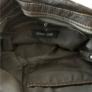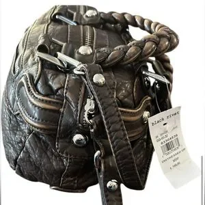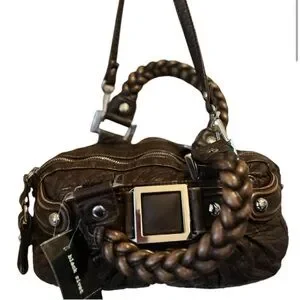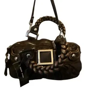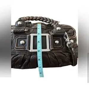 This women's shoulder bag is crafted from distressed faux leather in a dark brown hue, featuring a stylish metal buckle accent. It includes a braided handle and offers a spacious interior, making it suitable for everyday use or casual outings. The model number is GG-05-35. The bag is new with tags. Keywords: distressed leather, shoulder bag, dark brown, women's fashion, metal buckle, braided handle, spacious interior, casual outings, everyday use, new with tags.