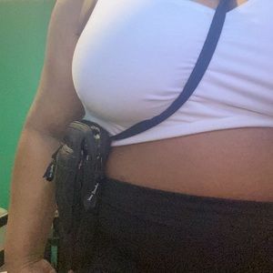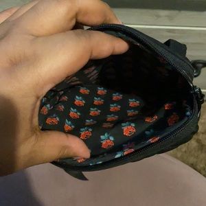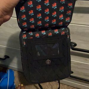 Black cross body purse w/adjustable strap. Has 4 pockets that have rose fabric inside.