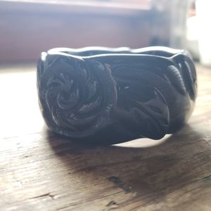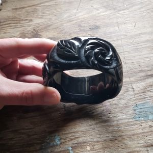 This wide lucite bangle is meant to resemble hand carved water Buffalo horn. It features beautiful roses and leaves "carved" into a rich black lucite. The inside diameter measures 2-5/8". The outside diameter is 3-1/4". The width is 1-1/2". Let me know if you have any questions. Thanks!