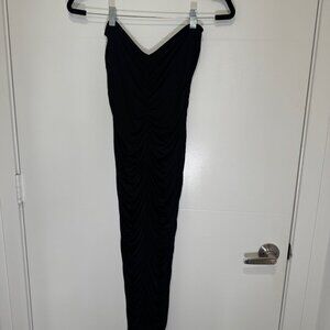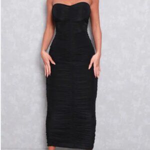 BLACK RUCHED BODYCON STRAPLESS MIDI DRESS SIZE L