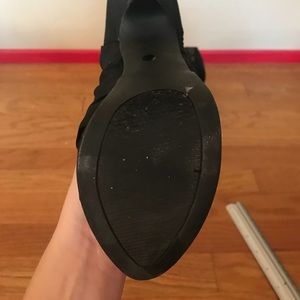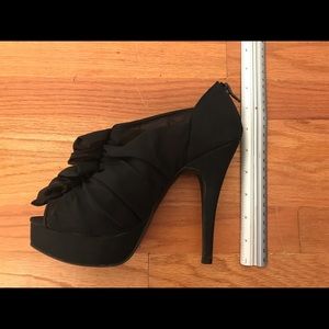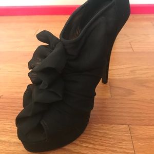 Gently used black heels with a cute fabric ruffle.