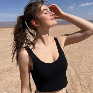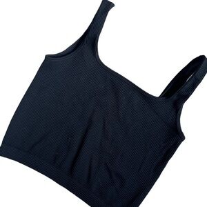 Black ribbed tank top in a size small. This tank top is fitted, cropped and has a square neckline with thick straps. The tank top is seamless and has a thick ribbed underband for extra support. This tank is in excellent preloved condition with no flaws.