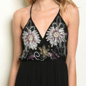 BLACK SEQUIN AND EMBROIDERED MAXI DRESS