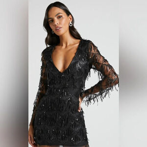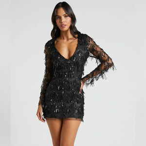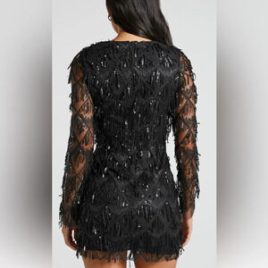 Can I hear a little commotion for the dress?! This Stunning Long Sleeve Dress will have all eyes on you this event season! This hot but elegant number has a body-skimming mini silhouette with long sheer sleeves and a diamond-look sequin overlay.