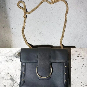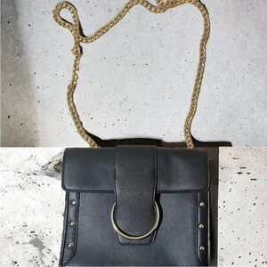 BLACK STUDDED LEATHER CROSSBODY WITH GOLD CHAIN STRAP AND GOLD BUCKLE CLOSURE