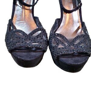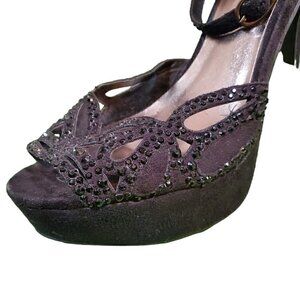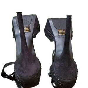 Black faux suede platform stilettos by Zigi Soho. Double ankle strap. Embellished with black rhinestones. Size 6. A few of the rhinestones are missing. A73-A1