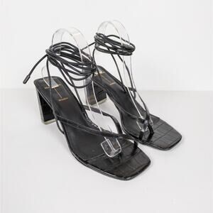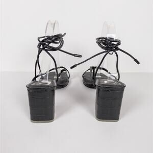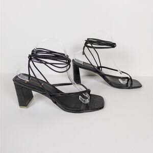 Black croco stamped leather Delilah Strappy Sandals with block heel, wraparound ankle straps, and thong inspired styling by Black Suede Studio. MSRP $268