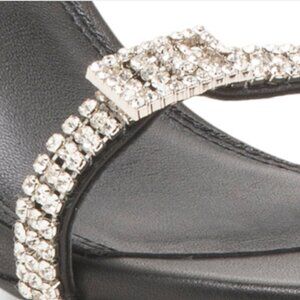 continental heel, cushioned footbed, leather lining, goring detail for stretch, jewel embellished band, buckle accent
