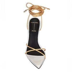 BLACK SUEDE STUDIO Talia Heels shoes Sandals Silver Gold ankle tie Revolve 8.5