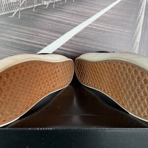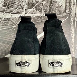 These black Vans feature a sleek, minimalist design with a soft, sock-like suede upper and a contrasting white sole. The slip-on style ensures a snug fit, making them perfect for casual outings.