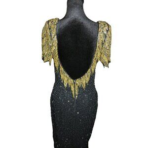 BLACK TIE presents a vintage, stunningly embellished evening dress. Fashioned in black and gold, it features intricate beading and sequins on 100% silk. A show-stopping piece for any formal occasion.