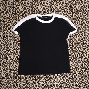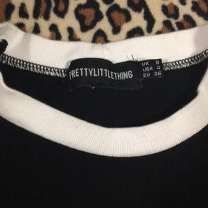 Pretty Little Thing black top. It has white piping detailing along color and shoulders. It is a size small, is supposed to be a tight fit and slightly cropped! Has never been worn, new!