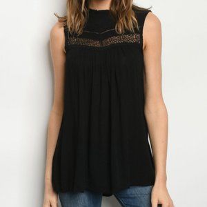 Sleeveless ruffled round neck lace trim yoke detail tunic top.