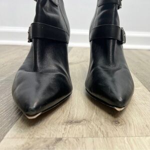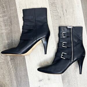 Black triple buckle zip up booties. Silver metal hardware. Zippers function well. Approx 3.5 inch heels.